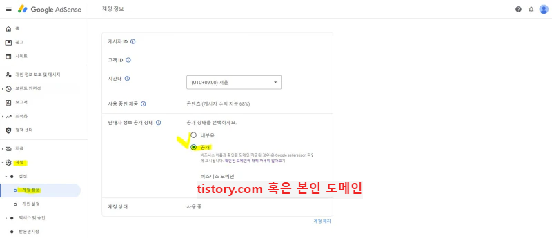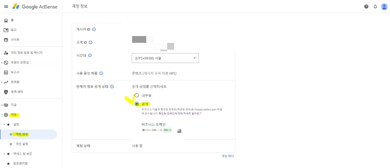 "Google sellers.json 파일에 게시하기 바랍니다 현재 공개 상태를 검토하려면 계정 설정 페이지 방문하세요 "라는 메시지로 나오는데 쉽게 이해하자면 구글 광고주가 광고를 어떤 사람에게 노출해주고 있는지 알리기 쉽게 하기 위해서 투명하게 공개를 했으면 좋겠다는 메시지와 같습니다. 왜 구글은 항상 무섭게 이야기하는지 모르겠습니다. 간단히 이야기하면 결국 안내문에 불구 한데 말이죠.